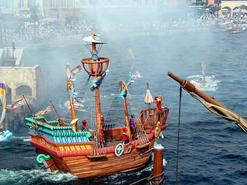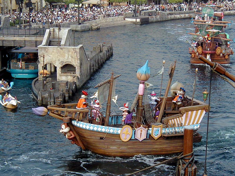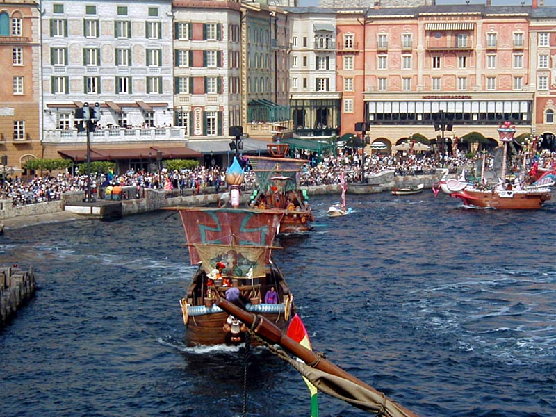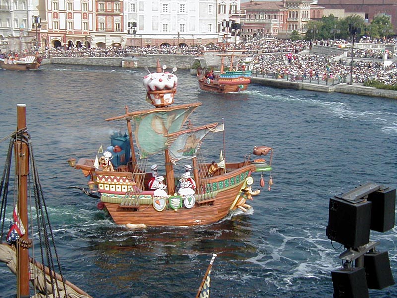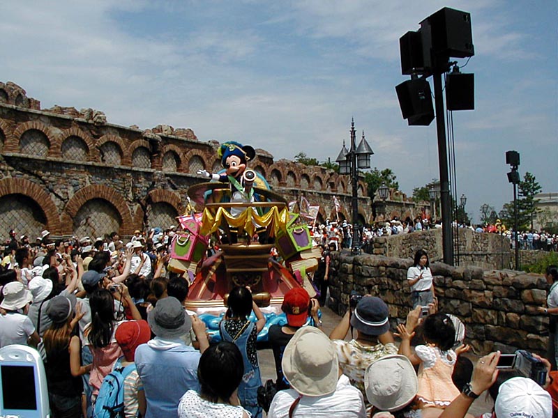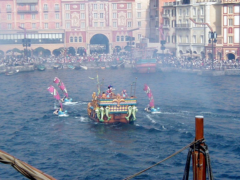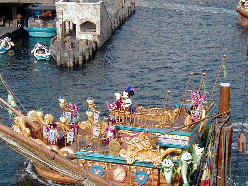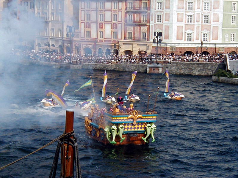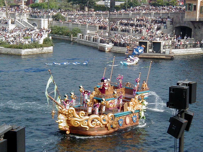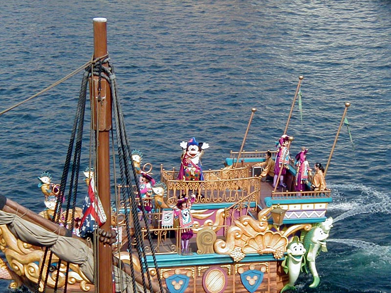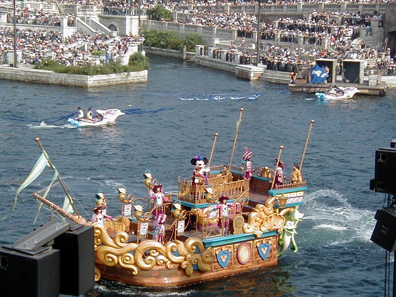 | 10時より「リドアイル・ミート&スマイル」を見ることに。おぉ!ミッキーとかが上陸して来た。 |