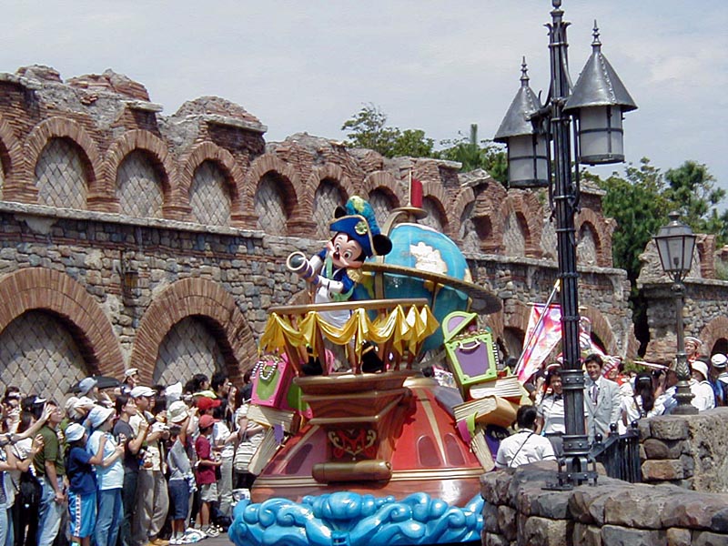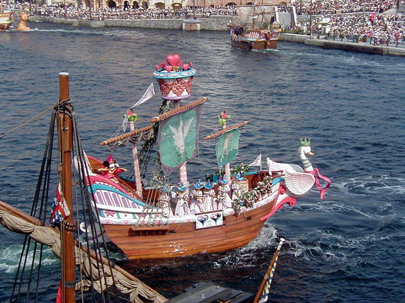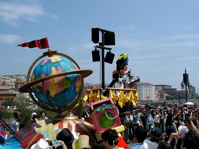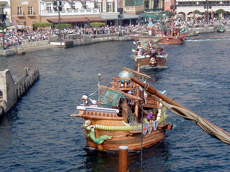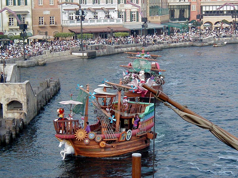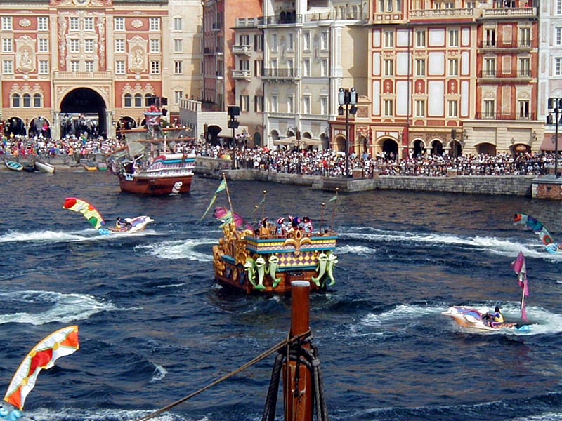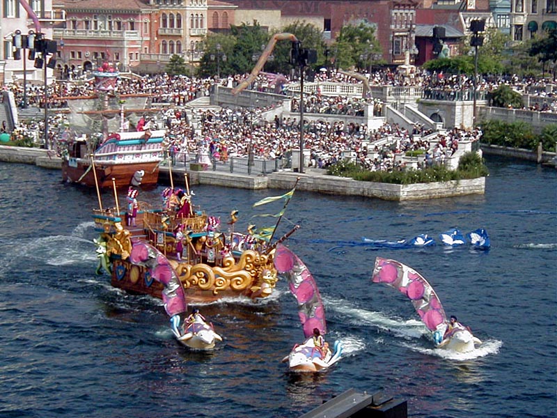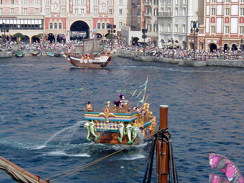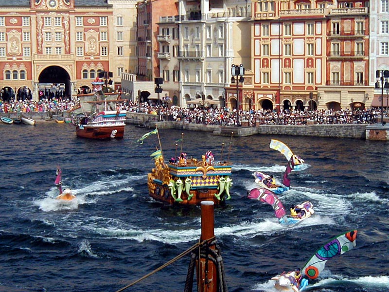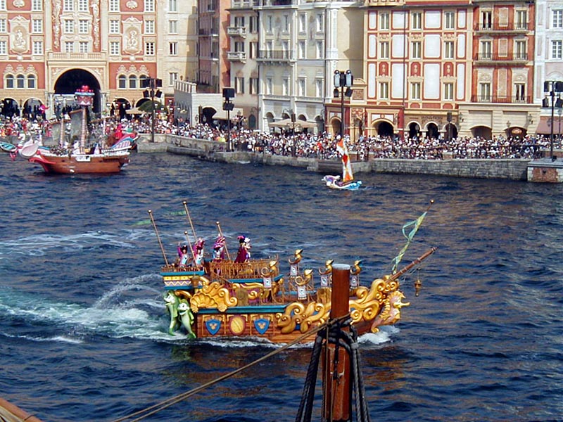 | 10時より「リドアイル・ミート&スマイル」を見ることに。おぉ!ミッキーとかが上陸して来た。 |