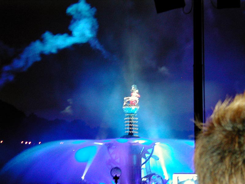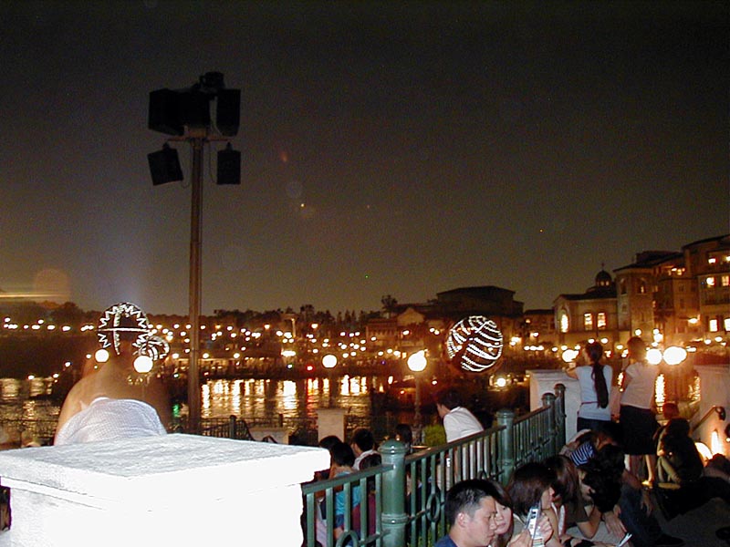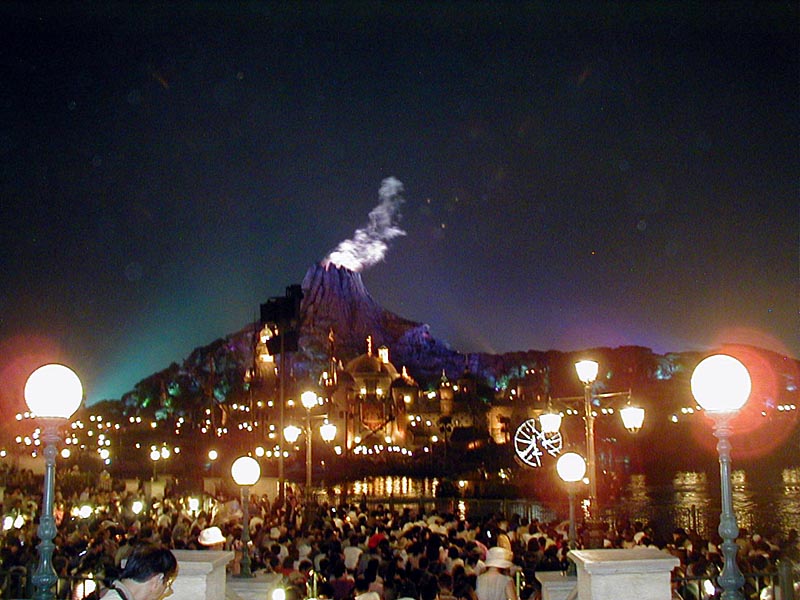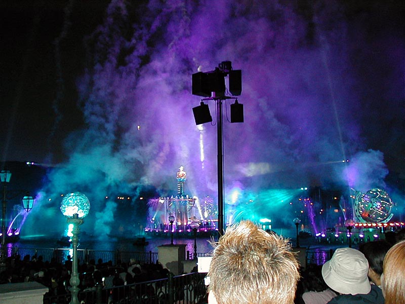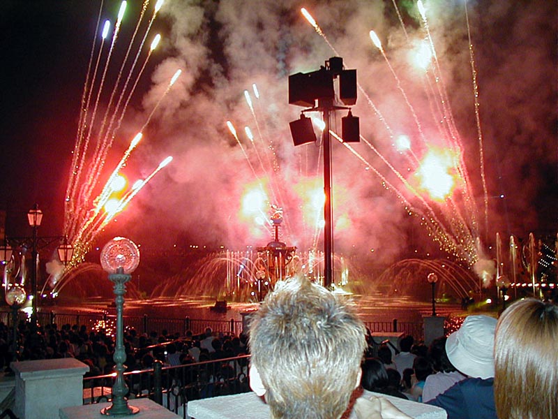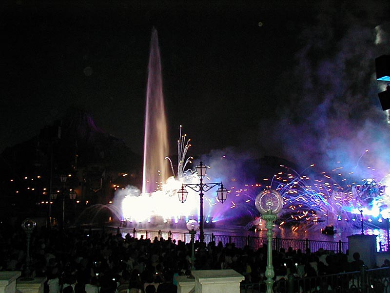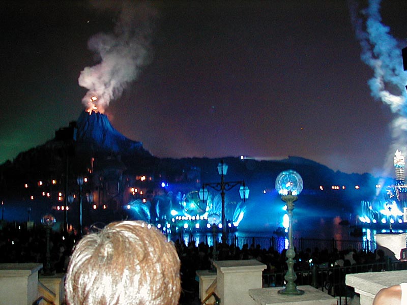| 20時15分より「ディズニー・シンフォニー」が始まる。水上と夜空を舞台に噴水や照明などの演出がなかなか見応えあり!背後のプロメテウス火山もショーに加わってました。 |