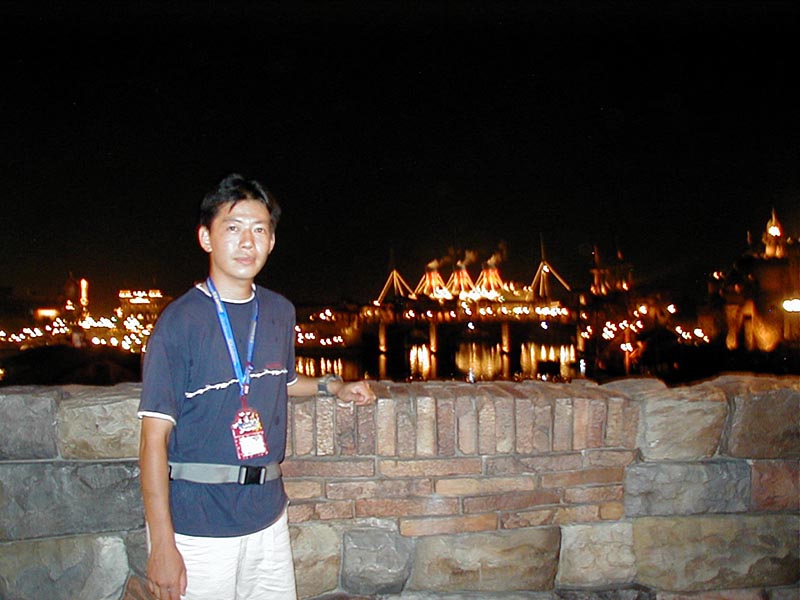 さて、お土産を買ったりして、夜景?のディズニーシーで記念撮影する。遊び疲れた〜。 |